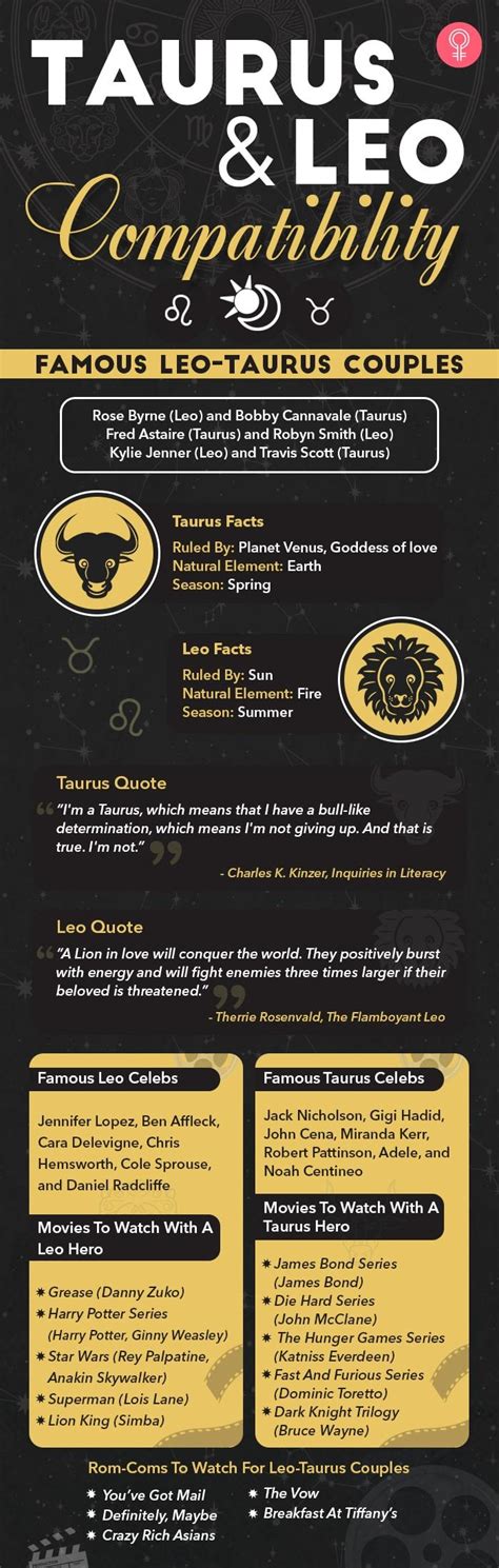 With leo ruled by the sun, symbolising life itself, and taurus ruled by romantic venus, the astrological compatibility between this couple is off to a good start. Taurus wants to be secure in terms of finances, love life and social security. The low scores represent the initial compatibility of this match. During arguments, taurus abhors conceding a point, seeing it..